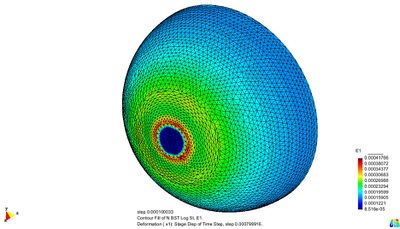A continuación se muestran las deformaciones principales a lo largo de toda la geometría (figuras 19 y 20) para la presión en que aparece el daño. Como a la tapa fictícia se se ha dado un espesor diez veces mayor, la deformación es mínima en esta zona. Las deformaciones mayores se producen en la zona donde en la realidad física se une el domo con el cilindro (al igual que en el caso del daño).