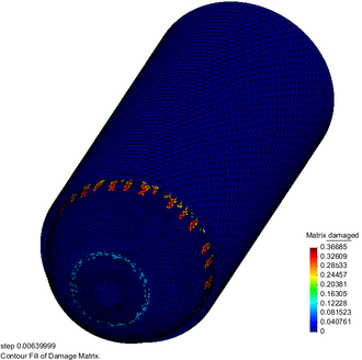 En este caso aparece daño a los 39,25 MPa de presión, que corresponden al 56% de la presión de explosión. El daño se localiza inicialmente en zona del domo que se une con el cilindro y en menor grado en las proximidades de la tapa. En toda la geometría no aparece daño en las fases iniciales de daño en la matriz. El cilindro no daña.
