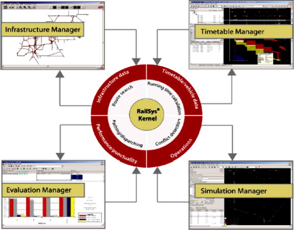 RailSys simulation program is a synchronous microscopic simulation program for railway systems that made at the Institute of Transport, Railway Construction and Operation (IVE). RailSys consists of the four program elements (Fig. 1), these are: