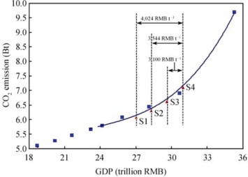 We consider 4 scenarios of the average annual GDP growth rate for China from the base year (2005) to the planning year (2010) (denoted as S1, S2, S3, and S4): 8%, 9%, 10% and 11% respectively. The GDP of 2010 would be 27.02, 28.29, 29.61, and 30.98 trillion RMB, respectively. According to the curve in Figure 1 , the corresponding CO2 emissions are 6.1, 6.3, 6.6, and 7.1 Bt, respectively.