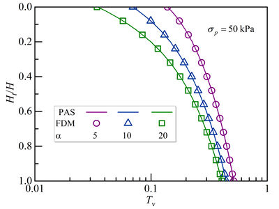 | Figure 6. Comparison of consolidation between the proposed analytical solution (PAS) and finite difference method (FDM) |