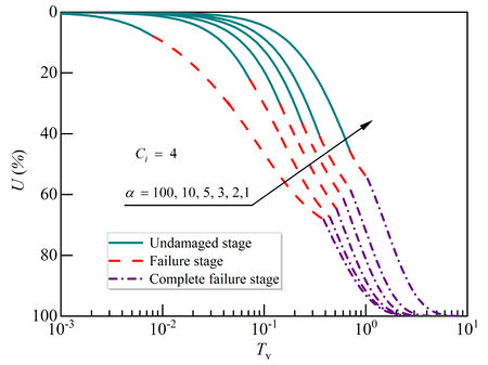 Figure 7 illustrates the influence of interface parameter on consolidation degree for the case with a constant consolidation coefficient ratio of (i.e., case 3) and different interface parameters of , and . It can be seen that the larger the interface parameter is, the faster the excess pore-pressure dissipates and the earlier the effective stress reaches the structural yield stress. Hence, the time in the undamaged stage becomes shorter and the consolidation rate becomes faster. Moreover, it can also be seen that the smaller the interface parameter is, the greater the degree of consolidation of structural soil is after entering the failure stage.