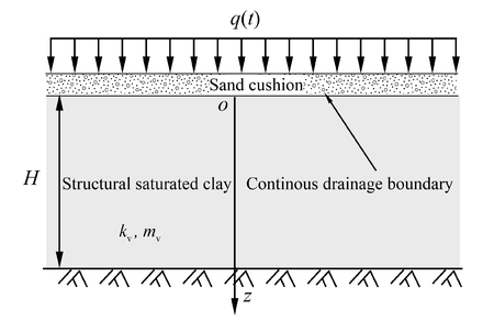 It should be noted that all analyses mentioned above were conducted based on the fully permeable boundary conditions. Once the load acting on structural soft soil exceeds the soil structure yield stress, the soil will be damaged from the boundary. However, the drainage boundary of soil in practice should be described as a semi-permeable boundary related to time, which is so-called the Neumann boundary condition. It has the disadvantage that it is not easy to obtain an analytical solution. In view of this, a time dependent continuous drainage boundary, which is essentially a Dirichlet boundary condition, has been proposed by Mei et al. [20]. However, there is no reference about the derivation of consolidation solution for structural soils under continuous drainage boundary condition.