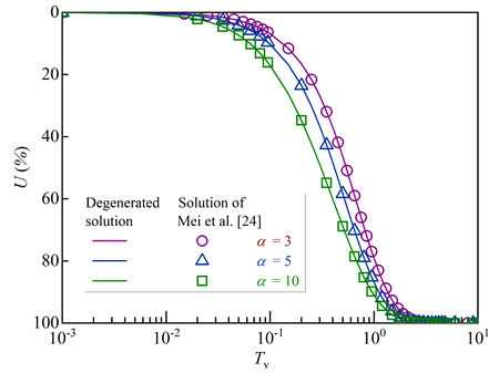 Based on the analytical solution of consolidation process for non-structural soil with continuous drainage boundary derived by Mei et al [24], the structural soil parameters in this study have been transformed into the non-structural soil parameters, i.e., and . The comparisons between the two approaches for different interface parameters (e.g., 3, 5 and 10) are shown in Figure 4. It can be seen that the proposed solution matches with the solution calculated by Mei et al [24] well. Therefore, the correctness of the present solution is preliminarily demonstrated.