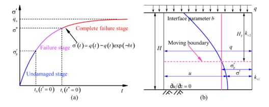 | Figure 3. Sketch of one-dimensional consolidation of structured soils. (a) Division of different soil structure failure stages. (b) Moving boundary due to the development of boundary failure |