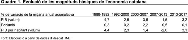 Ampliant el focus temporal es pot apreciar el fort creixement del PIB a Catalunya entre el 1986 (any de l’adhesió espanyola a la Unió Europea) fins al 1992, any de l’inici del mercat únic europeu. Els anys posteriors fins al 2000, el creixement de l’economia catalana va ser clarament més moderat. Entre el 2000 i el 2007 el PIB torna a enlairar-se, però a diferència dels períodes previs, aquesta evolució va acompanyada d’un augment important de la població, fet que explica els dèbils resultats del PIB per habitant. En els anys posteriors (entre el 2007 i el 2013), té lloc una caiguda de l’economia (de l’1,5 % en taxa mitjana anual acumulativa). En el conjunt d’aquest període, tot i la crisi la població continua augmentant, ( i només deixa de fer-ho a partir del 2012), fet que enfonsa encara més el PIB per habitant. Finalment, en els darrers quatre anys de recuperació fins al 2017, el PIB augmenta en termes reals a una taxa mitjana anual acumulativa del 3,2%. La població ha tornat de nou a créixer a partir del 2015, per bé que les taxes de creixement són modestes, de manera que el creixement real del PIB per habitant se situa en aquest període en un 3,1% (quadre 1).