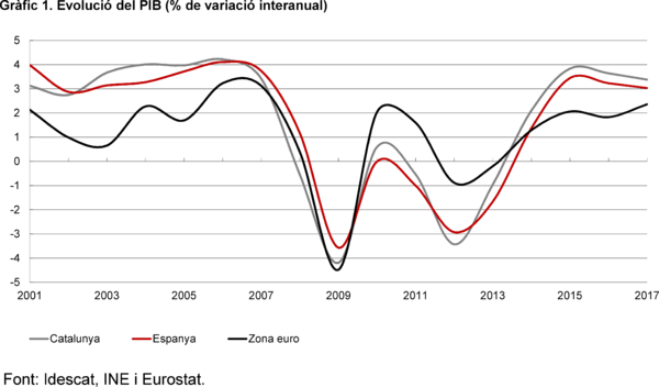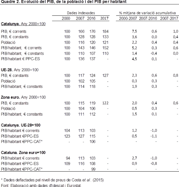 Al tenir en compte el creixement acumulat, es constata que el PIB tant en valors corrents com en valors constants ha superat amb escreix els nivells del 2007, previs a l’inici de la crisi. Per la seva part, el PIB per habitant en valors constants ha assolit també durant el 2017 els valors del 2007 i està un 10% per sobre dels valors del 2000. Però aquests resultats són inferiors als obtinguts pel conjunt de la UE-28, on es produeix un creixement més alt del PIB per habitant tant en relació amb el 2007, com en relació amb l’any 2000. El mateix es pot dir, però a una escala inferior en relació amb la zona euro. Aquest diferencial de creixement del PIB per habitant es deu principalment a l’evolució de la població: d’un creixement del 20% a Catalunya i del 5% a la UE-28, ja que els diferencials de creixement del PIB són de menor importància. Aquest és un dels fets principals que caracteritzen l’economia i la societat catalana en aquests anys: el fort creixement de la població i la seva repercussió en tots els àmbits.