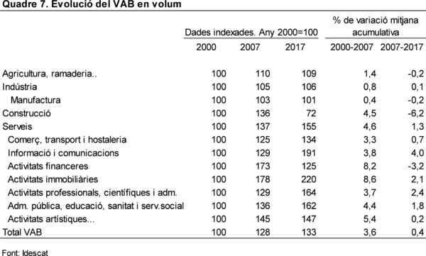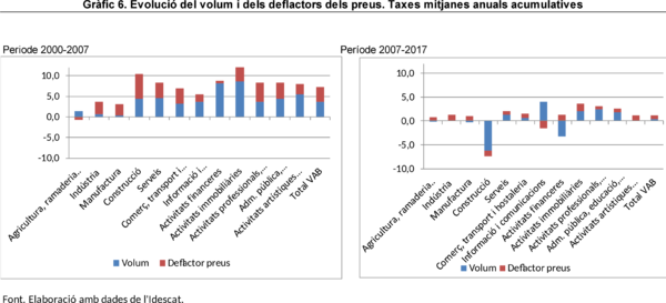 En el període que va del 2007 al 2017, el volum de la indústria augmenta en taxa mitjana acumulativa a un ritme del 0,1%, enfront de l’1,3 % els serveis, i la caiguda del 6,2 % la construcció. Però contràriament a la situació prèvia a la crisi, l’evolució relativa dels preus del sector industrial ha estat més positiva que la de la resta de l’economia, la qual cosa li ha permès guanyar pes en valors corrents. Cal també tenir present que d’ençà el 2014 el sector industrial experimenta creixements superiors, tant en volum com en deflactors, als de la resta de l’economia.