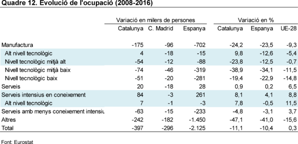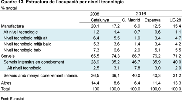 Malgrat que ha perdut ocupació en el sector manufacturer, Catalunya continua tenint el 2016 una proporció d’ocupació en aquest sector (d’un 17,2%) més elevada que Espanya (12,5%) i que la mitjana de la UE-28 (15,4%). És encara més significatiu el fet que l’ocupació industrial d’alt nivell tecnològic i de nivell tecnològic mitjà alt estigui a Catalunya per sobre de la mitjana europea (1,4 %, i 5,5 % Catalunya i 1,1% i 4,7% a la UE-28). En l’àmbit dels serveis intensius en coneixement, la posició de Catalunya (35,2 % de l’ocupació el 2016) és comparativament menys positiva, perquè està una mica per sota de la mitjana espanyola (35,9%) i clarament a un nivell inferior al de la mitjana europea (40%). La comparació amb la comunitat de Madrid (46,7%) és encara molt més distant. Si s’analitzen de forma més específica aquests serveis, els que es consideren d’alt nivell tecnològic, HT KIS, (High tech knowledge-intensive services), la posició de Catalunya (3,1% de l’ocupació) és lleugerament superior a la mitjana de la UE-28 (2,9%) i a la mitjana espanyola (3%), però és precisament en aquests serveis tecnològicament més avançats on es concentren les principals diferències en relació amb Madrid, on el percentatge d’ocupació en aquests serveis arriba al 7,8% de l’ocupació total. Finalment, cal destacar com aspecte diferencial en relació amb la mitjana europea l’important pes que tenen a Catalunya (i a Espanya) els serveis amb menys coneixement intensiu, fet que pot representar un fre per l’avenç de la productivitat (Quadre 13).