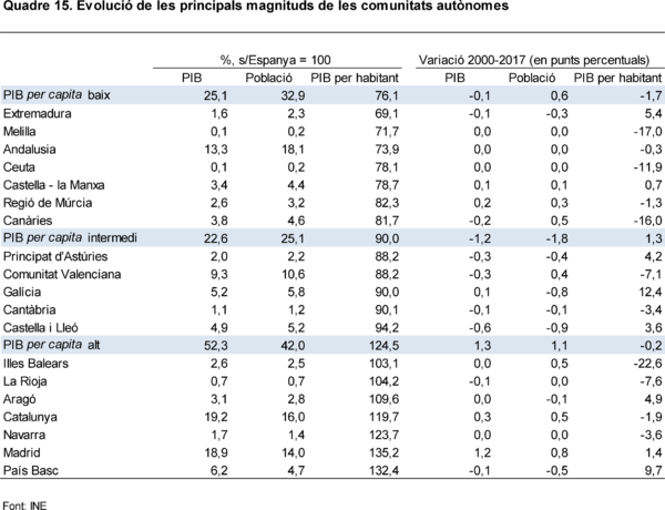 En el cas d’Espanya, l’evolució de l’economia de les CA, malgrat els elevats volums de fluxos interregionals, no semblen constatar una millora en la distribució del PIB ni en els nivells del PIB per habitant. Segons les darreres dades de l’INE del 2017, el PIB per habitant a Espanya oscil·la entre un mínim de 69,1% de la mitjana espanyola a Extremadura i un màxim de 132,4% al País Basc. Aquests resultats estan valorats en euros corrents i no tenen en compte els diferents nivells de preus entre comunitats autònomes (CA), que reduirien aquest diferencial. Catalunya és la quarta CA amb el PIB per capita més elevat i la segona amb la taxa de creixement més alt entre el 2000 i el 2017, lluny però del creixement del PIB que experimenta la comunitat de Madrid (malgrat això des del 2013 el creixement acumulat de Catalunya és superior). El grup de CA amb el PIB per capita mes baix no ha guanyat pes en el PIB, però ha augmentat la seva participació en població, fent retrocedir encara més el seu nivell de PIB per capita relatiu. Les CA amb un nivell econòmic intermedi són les més perjudicades, retrocedint en PIB, però encara més en població, raó que explica la millora comparativa en PIB per habitant. Finalment, les CA més ben posicionades, són las úniques que en conjunt han guanyat pes econòmic i poblacional. En termes de PIB per habitant aquest conjunt de CA globalment considerades han reduït lleugerament posicions, tot i que l’Aragó, Madrid i sobretot el País Basc n’han guanyat, si bé el País Basc ho ha fet perden població.