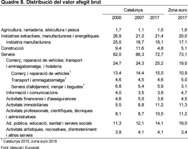 En relació amb la zona euro el pes de la indústria a Catalunya el 2017 és 1,4 punts percentuals superior a Catalunya. També és superior el pes del comerç, de l’hostaleria i de les activitats artístiques i recreatives. En contraposició, Catalunya té un pes inferior en el sector públic, educació, sanitat i serveis socials, en el sector financer, en la branca d’informació i comunicacions, i en els activitats professionals, científiques, tècniques i administratives.
