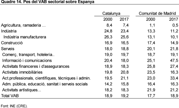 A nivell sectorial l’especialització de Madrid en serveis associats a alts nivells de coneixement es posa de manifest en l’elevada presència en la comunitat de Madrid de branques com la d’informació i comunicacions que concentra en aquesta comunitat el 47,5 % del VAB generat a Espanya, amb un augment de 22,4 punts percentuals de participació entre el 2000 i el 2017. Les activitats professionals, científiques, tècniques i administratives representen el 33,4% del total estatal, 10,4 punts més que el 2000. Cal esmentar també les activitats financeres que representen el 27,4% del total espanyol, 1,6 punts percentuals més que el 2000. Aquesta especialització sectorial ha permès la comunitat de Madrid guanyar pes (1,2 punts percentuals) en l’economia espanyola entre el 2000 i el 2017. Tot i això, cal dir que en el conjunt dels darrers quatre anys l’economia catalana ha estat més dinàmica que la de la comunitat de Madrid i el pes de Catalunya sobre el total espanyol ha augmentat fins al 19,2%.