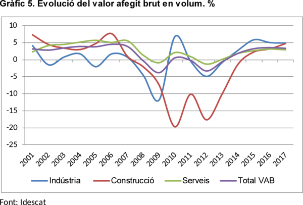 L’evolució del sector de serveis ha estat molt més estable per la gran quantitat d’activitats que hi engloba i per la diversificació de la seva demanda; però tot i això després dels forts creixements previs a la crisi, també el sector de serveis es veu arrossegat fins a taxes negatives, recuperant la dinàmica positiva a partir del 2014. Pel que fa a la indústria, la seva evolució durant la fase expansiva, va ser clarament inferior ala del conjunt de l’economia (tant pel que fa al creixement en volum, com en preus); perdent quasi 6 punts en l’estructura productiva. La crisi va enfonsar l’activitat industrial, però a partir del 2012 el sector industrial comença a redreçar-se, i el 2017 recupera el volum de producció que hi havia el 2007 (Gràfic 5 i Quadre 7).