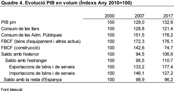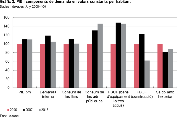 En el cas de la despesa en consum de les Administracions públiques entre el 2007 i el 2017 s’ha produït, en canvi, un creixement important en termes per capita, del 12,3 %, que significa una taxa anual mitjana acumulativa de l’1,1%, que queda lluny però del creixement del 3,9% durant el període 2000-2007. El nivell de la FBCF de béns d’equipament i altres actius per capita, és el 2017 només lleugerament inferior al del 2007, però el de la construcció és la meitat. Pel que fa al saldo amb l’exterior, s’han millorat els valors del 2007, però estan per sota dels del 2000. Malgrat aquest comportament en termes constants, l’evolució de la relació real d’intercanvi ha permès guanys importants del saldo amb l’exterior, de manera que en termes corrents i en relació amb el PIB el superàvit exterior ha passat del 8% el 2000 al 12,2 % el 2017.