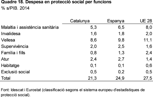 Finalment, un altre manera de situar el volum i la distribució funcional de les despeses socials a Catalunya en relació amb la mitjana espanyola i europea és a partir de la informació elaborada per l’Idescat sobre les despeses en protecció social a Catalunya (classificades segons el sistema europeu d’estadístiques de protecció social). Aquestes dades (que no inclouen les despeses d’ensenyament) mostren que el 2014 el volum de despeses a Catalunya en protecció social era del 21,3 % del PIB (un 24,9 % a Espanya i un 27,5% a la UE-28). Només en el cas de les prestacions d’atur i de supervivència Catalunya està per sobre de la mitjana de la UE-28, fet que posa en evidència la distància en atenció social que separa Catalunya de la mitjana europea.