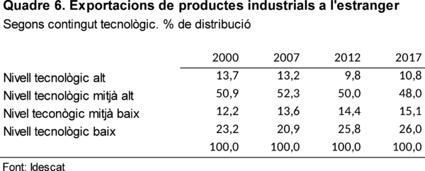L’augment de les exportacions a l’estranger es va concentrar els primers anys de la crisi en un increment del volum de vendes de les empreses que ja eren exportadores, però més recentment el que es detecta és que l’augment de l’exportació recau en l’augment del nombre d’empreses que s’han obert a l’exportació de forma regular. Un altre aspecte a considerar en l’impuls exportador durant els anys de crisi és que recau en un predomini de les exportacions industrials de menor contingut tecnològic, atès que tant les de nivell tecnològic alt com de mitjà-alt perden pes en l’estructura exportadora, un fet que s’ha començat a capgirar els darrers anys en el cas de les exportacions de nivell tecnològic alt, però que encara es manté a la baixa en les de nivell tecnològic mitjà-alt (Quadre 6).