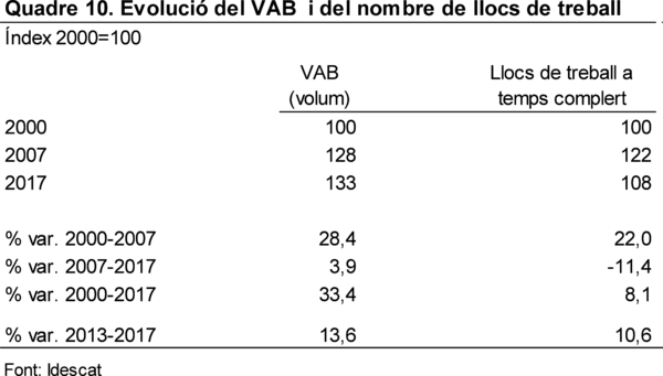 La reassignació sectorial i els canvis de productivitat han impactat en els nivells d’ocupació, i així com els valors de la producció han recuperat els valor precrisi, això no ha passat en els nivells d’ocupació. De fet, el 2017 hi ha 413,2 milers de llocs de treball (en termes equivalents a temps complet) menys que el 2007. Aquesta situació contrasta amb la del període previ a la crisi, amb un model més intensiu en treball que va donar lloc a una elevada creació de llocs de treball (del 22% entre el 2000 i el 2007). En canvi, entre el 2007-2017 s’ha produint un descens de l’11,4% (tot i l’augment del 10,6% entre el 2013 i el 2017). Si es considera l’evolució des del 2000, Catalunya ha augmentat fins al 2017 un 8,1% de llocs de treball nets a temps complet (com s’ha vist en el quadre 9, l’evolució en termes de nombre d’ocupats, llocs de treball i hores de treball,és superior). En qualsevol cas, el que s’ha de tenir present és que, al comparar els períodes d’abans i de després de la crisi s’estan comparant dos models de creixement diferents, el previ a la crisi amb una forta presència del sector de la construcció, alt endeutament i intensiu en treball, que es va demostrar insostenible i un model actual més productiu, més tecnològic i amb més presència del sector de serveis, però també menys intensiu en ma d’obra (Quadre 10).