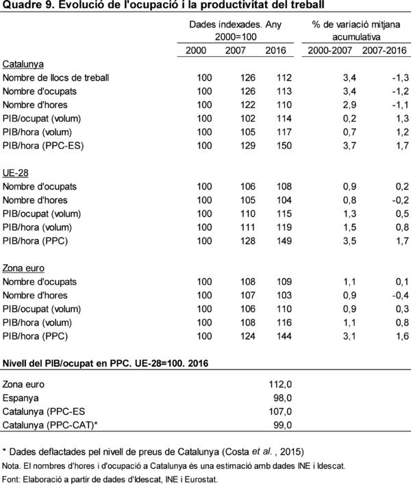 Per avaluar els canvis relatius en el nivell de productivitat de Catalunya, s’ha calculat la seva evolució corrent deflactada per les paritats de poder de compra espanyoles (PPC-ES). Els resultats mostren un creixement del 50% entre el 2000 i el 2016, molt similar al de l’UE-28 però superior al de la zona euro, la qual cosa indica que els nivells de productivitat aparent del treball de Catalunya en PPC-ES, entre el 2000 i el 2016 tot just s’hauran mantingut en relació amb la UE-28, però hi hauran millorat en relació amb la zona euro. Pel que fa al nivell actual, la zona euro té el 2016 un nivell de productivitat per hora treballada un 12% superior a la mitjana de la UE-28 i Espanya un 2% inferior. Catalunya, se situa un 7% per sobre de la mitjana europea tenint en compte les PPC-ES, però en termes de paritats de poder de compra de Catalunya (PPC-CAT) la posició baixaria fins a ser un 1% inferior, per tant molt similar a la mitjana espanyola (Quadre 9).