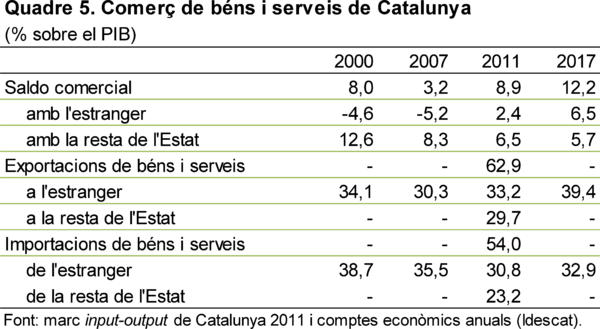 Durant el període previ a la crisi el saldo comercial de Catalunya es va reduir fins a un 3,2% (el 2007), i va ser a partir del 2011 que es va anar recuperant fins a un superàvit del 8,9% el 2011 i del 12,2% el 2017. La millora del superàvit del sector exterior és un dels fets més remarcables en el comportament recent de l’economia catalana; cal dir que aquesta millora es concentra en els intercanvis amb l’estranger, que guanyen pes, al contrari del que passa amb els intercanvis amb la resta de l’Estat, que en perden. Així, mentre que el 2000 tot el superàvit comercial es produïa en els intercanvis amb la resta de l’economia espanyola, el 2017 el superàvit amb l’estranger és, pràcticament, el mateix que el que hi ha amb la resta de l’Estat. Els guanys comercials es deuen, d’una banda, al creixement de les exportacions de béns i serveis a l’estranger ( han guanyat 5,3 punts percentuals (pp) del PIB entre el 2000 i el 2017 i, 9,1 pp entre el 2007 i el 2017) i, d’una altra, a la contenció de les importacions (que el 2017 han baixat 5,8 pp del PIB en relació amb el 2000 i 2,6 pp en relació amb el 2007). Això explica que el que el 2000 era un dèficit comercial amb l’estranger del 4,6 % del PIB, s’hagi convertit en un superàvit equivalent al 6,5% del PIB el 2017.