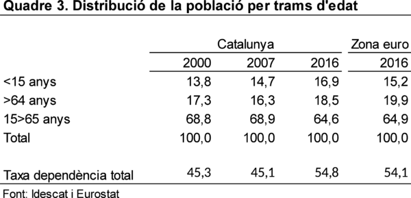 Aquestes dades resumeixen els importants xocs de l’economia catalana durant aquests anys, no només econòmics sinó també demogràfics. En efecte, Catalunya ha viscut un creixement de la població del 20%, d’una població d’orígens, llengües i cultures molt diverses en un període molt curt de temps i, precisament, just abans d’una crisi econòmica de magnituds poc vistes, fet que demostra la gran capacitat d’integració de la societat catalana. És dins d’aquest context de xoc poblacional que s’han d’analitzar moltes de les magnituds econòmiques, laborals i socials a Catalunya durant aquests anys. Una de les primeres conseqüències del fort creixement demogràfic és que el 2007 va augmentar la proporció de població de menys de 15 anys i es va frenar inicialment l’envelliment. En conjunt, però, el 2007 la taxa de dependència de la població era pràcticament la mateixa que el 2000. El 2016 els efectes en la població més jove encara són vius: la població de menys de 15 anys té més pes que no pas el 2007, però amb una tendència que es va frenant per les baixes taxes de natalitat i de fecunditat (Quadre 3). Però la proporció de població de més de 64 anys ha guanyat pes, de manera que la taxa de dependència conjunta ha acumulat un augment significatiu, fins al 54,8% . Això té com a revers un descens de la població en edat de treballar: des del 68,9% de la població el 2007 al 64,6% el 2016, un fet en el que cal emmarcar la capacitat de creixement potencial de l’economia catalana, especialment perquè aquesta tendència, com apunten les projeccions de població de l’Idescat, s’aguditzarà els propers anys.