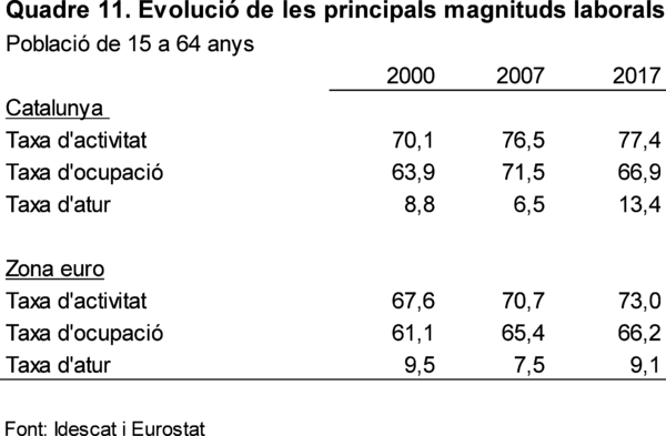 Tot i això, les dades que s’han presentat en el quadre 9 mostren que Catalunya entre el 2000 i el 2016 ha augmentat més el volum d’ocupació neta que la UE-28 i la zona euro. De fet, el 2017 la taxa d’ocupació de la població de 15 a 64 anys se situa a Catalunya en un 66,9 %, una mica per sobre de la zona euro (66,2 %). Però, en paral·lel, la població catalana té una taxa d’activitat 4,4 punts percentuals superior a la zona euro, i és precisament això el que explica que la taxa d’atur sigui també superior (Quadre 11).