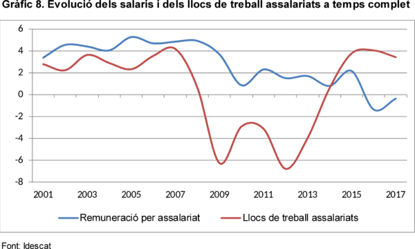 L’evolució de l’ocupació laboral desprès de la crisi ha estat molt marcada per la reassignació sectorial i tecnològica. I el balanç mostra la importància del vessant tecnològic a Catalunya, un aspecte especialment important per a la millora de la productivitat de l’economia. De fet, entre el 2008 i el 2016 l’ocupació en termes nets només ha augmentat a Catalunya en la manufactura d’alt nivell tecnològic i en els serveis intensius en coneixement incloent els d’alt nivell tecnològic (aquest creixement contrasta amb els resultats negatius que s’han produït a la comunitat de Madrid, on hi ha una presència molt més elevada d’aquests serveis en l’estructura productiva). Aquest tipus d’ocupacions estan vinculades a salaris més elevats que a la resta d’activitats. No obstant això, els salaris mitjans han retrocedit a Catalunya i l’augment de la pobresa entre la població ocupada que detecten les estadístiques de l’INE i de l’Idescat són un reflex de la polarització que hi ha actualment al mercat laboral. L’explicació sembla raure en el diferent comportament salarial entre els llocs de treball que no es van veure afectats per la crisi (stayers), que varen mantenir el lloc i les condicions de treball, i els llocs de treball més afectats per la crisi, amb continues rotacions i precarització laboral (movers), que han patit pèrdues salarials importants (Fernández, 2017).