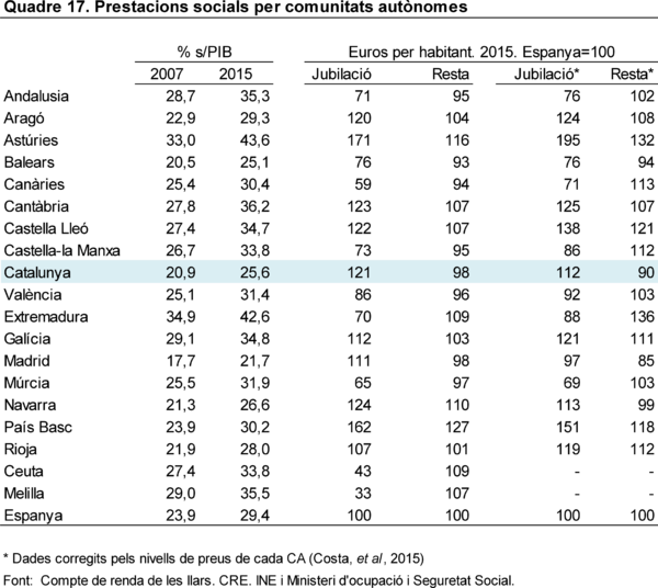El conjunt d’aquestes prestacions presenta un fort augment (de 5,5 punts percentuals del PIB espanyol) entre el 2007 i el 2015 per les conseqüències de la crisi. A escala de les CA els canvis entre els dos anys encara són més acusats. Les dades disponibles de l’INE no permeten diferenciar el caràcter contributiu i no contributiu d’aquestes prestacions socials ni tampoc la seva distribució funcional. No obstant això, a partir de la informació del Ministeri d’ocupació i Seguretat Social s’ha aïllat la part corresponent a les pensions contributives de jubilació, que conforma el grup més important. Els valors agregats mostren que el 2015 Catalunya va rebre unes prestacions socials en relació amb el seu PIB que estan entre els nivells més baixos (25,6%) de les CA, juntament amb les Illes Balears (25,1%) i la comunitat de Madrid (21,7%). A l’extrem oposat, hi ha Astúries (43,6%) i Extremadura (42,6%). En termes de població es presenten les dades en valors corrents i deflactades pel nivells de preus de cada CA (a partir del treball de Costa, et al, 2015), separant la part corresponent a les pensions contributives de jubilació de la Seguretat Social de la resta de prestacions. Les pensions de jubilació per habitant a Catalunya en euros corrents són un 21% superior a la mitjana estatal. Això és deu, bàsicament al fet que a Catalunya hi ha un major volum de població que ha cotitzat i té dret a aquestes pensions. En canvi, en la resta de prestacions Catalunya està per sota de la mitjana estatal. El País Basc i Astúries són, de nou, les CA que tenen els nivells més alts. La distribució d’aquestes prestacions, un cop deflactades pels nivells de preus de cada CA, continua situant Astúries i el País Basc en les dues primeres posicions en pensions de jubilació, mentre que el nivell de Catalunya respecte de la mitjana se situa en aquest cas en un 12% per sobre. Pel que fa a la resta de prestacions, Astúries i Castella Lleó ocupen les primeres posicions, mentre que Catalunya se situa un 10% per sota de la mitjana espanyola.