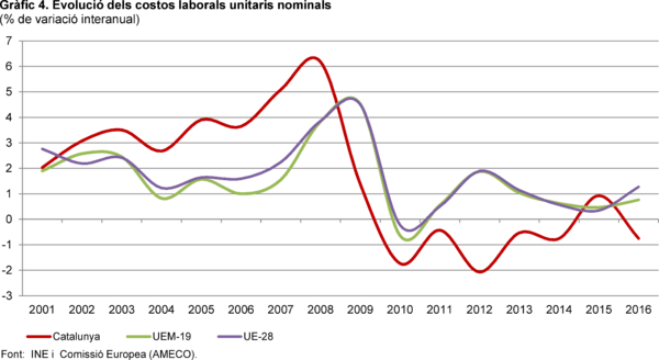 Pel que fa al comerç amb la resta de l’Estat, el comportament és l’invers al que té lloc amb l’estranger, i el superàvit del 12,6% del PIB el 2000 s’ha reduït fins al 5,7 % el 2017, (Quadre 5). Sota aquests canvis profunds en l’orientació comercial hi ha incidit la forta caiguda de la demanda de l’economia espanyola acumulada durant els anys de crisi i els esforços fets per les empreses catalanes en posicionar-se en els mercats exteriors, en la Unió Europea i especialment en la resta del món. Els guanys de competitivitat han jugat, així mateix, un paper clau, gràcies a la reducció dels costos laborals unitaris a partir del 2010, tant per la moderació salarial com per l’augment de la productivitat aparent del treball (Gràfic 4). Aquest comportament contrasta amb l’experimentat els anys previs a la crisi (fins al 2008) amb creixements dels costos laborals unitaris força superiors als de la mitjana europea. D’altra banda, cal afegir la millora competitiva en els mercats denominats en dòlars per la depreciació entre el 2007 i el 2017 del tipus de canvi de l’euro enfront del dòlar (d’un 17%).