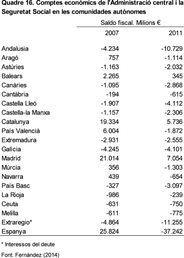 Es poden apreciar els importants canvis que la crisi provoca en els comptes públics. El 2007 a escala estatal hi ha un superàvit fiscal de 25.824, mentre que al 2011 hi ha un dèficit de 37.242. La desagregació d’aquest saldo per CA mostra que l’Administració central i la Seguretat Social obté el 2007 a Catalunya un superàvit de 19.334 milions d’euros, mentre que el 2011 aquest superàvit se situa en 5.736, una reducció relacionada als estabilitzadors automàtics davant el retrocés de l’economia, amb uns menors ingressos impositius i de cotitzacions socials, i un augment de les prestacions socials.