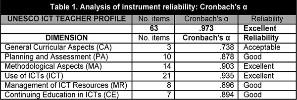 Homogeneity indices (corrected item-total correlation) were within what could be termed «Excellent», as they were all above 0.3. In conclusion, the instrument employed to study the ICT teacher training profile presented excellent reliability, obtaining a Cronbach’s a of .973 (George & Mallery, 1995).