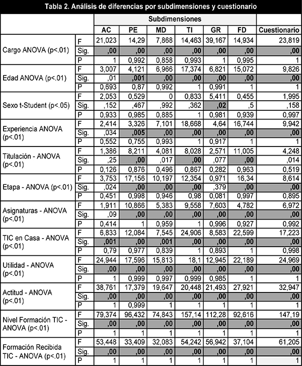 Los análisis diferenciales llevados a cabo (ANOVA - p=0,01) según la variable «Cargo» (profesor, coordinador TIC, y dirección y coordinación), indican diferencias claramente significativas y relevantes en todas las subdimensiones (AC, PE, MD, TI, GR y FD), así como en el cuestionario en general (0,000 sig. y 23,819 F), siendo aquellos que son Coordinadores TIC, como es obvio, los que obtienen un mayor nivel en el perfil de formación docente en TIC.