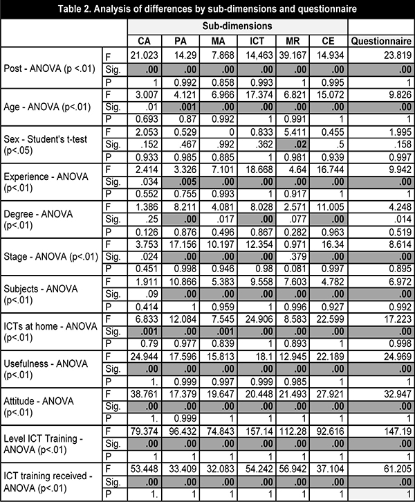The differential analyses performed (ANOVA - p=0.01) according to the «Post» variable (Teacher, ICT Coordinator and Management and Coordination) clearly indicated significant and important differences in all sub-dimensions (CA, PA, MA, ICT, MR and CE) and in the questionnaire in general (0.000 sig. and 23.819 F), and as was to be expected, those who were ICT coordinators presented a higher level in the ICT teacher training profile.