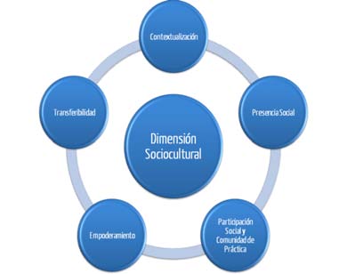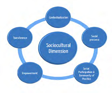En la «dimensión sociocultural», en general tutores y tutoras reflejan que esta experiencia ha estado contextualizada, teniendo en cuenta la hetereogeneidad de las estudiantes, y su adecuación a su realidad. Se establece que los contenidos trabajados a través de las actividades pueden aplicarse a sus contextos socioculturales. En cuanto a la «presencia social» como indicador de esta dimensión, se señala por encima de todos el componente «emotividad», destacando factores como los aspectos culturales e incluso la virtualidad como determinantes de este componente y para favorecer el establecimiento de las bases de una comunidad de práctica. Hay otros factores que se mencionan como determinantes de esa conformación de la comunidad de práctica, entre los que figuran: el diseño de la forma de trabajo, la plataforma virtual, el sistema de interacciones, la adaptación a las estudiantes y a sus conocimientos previos, las temáticas abordadas y la dinámica seguida en la formación. Por otro lado, también se profundiza en las actitudes necesarias en las participantes para la conformación de la comunidad de práctica. En este sentido, se incide en la predisposición, la curiosidad, la apertura hacia temas nuevos y el querer progresar y cambiar, la dedicación, la motivación, el compromiso y el deseo de participar. Las estudiantes confirman haberse sentido parte de una comunidad virtual de aprendizaje a través del diálogo fluido, la buena comunicación, la participación, el dinamismo, la colaboración y ayuda entre compañeras y, además, señalando como matiz que les resultaba divertido, como claves de este sentimiento comunitario. Se indica la eficacia de la tutoría para fomentar esas relaciones positivas y el buen desarrollo de la acción formativa.