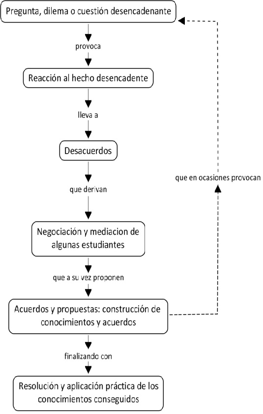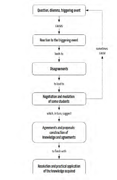 On putting into practice the didactic model proposed it should be emphasised that taking students from the level of the exchanging of ideas and reflections to the joint construction of knowledge, referred to «Cognitive Presence», is a task that entails difficulties in virtual teaching. It is observed that the students participate in the exchanging of opinions and the sharing of ideas, but that it is more difficult to go deeper into knowledge of some themes by means of debate on the forums. A response pattern was detected that is shown in the following diagram:
