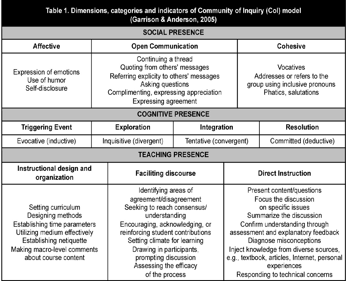 Garrison, Anderson y Archer (2000) proponen un modelo conceptual de aprendizaje online desde el cual se fomente la interacción entre docentes y estudiantes, con el fin de construir, facilitar, validar la comprensión y desarrollar capacidades que se dirijan a una continuidad de la formación, fomentando, simultáneamente, la independencia cognitiva y la interdependencia social. La característica primordial de este modelo reside en su potencial comunicativo e interactivo. Establece que los aprendizajes serán más profundos y significativos cuando converjan las tres «presencias» mencionadas. Estas dimensiones tienen la característica de poder ser aportadas a la comunidad por los distintos participantes, incluso más allá de sus roles específicos de estudiantes o docentes, con lo que supone un modelo flexible que permite captar la dinámica horizontal de una comunidad.