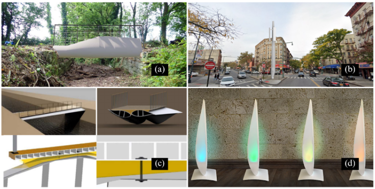 Los materiales compuestos EOL también pueden utilizarse de forma creativa en instalaciones artísticas o en el diseño de mobiliario. Canvus, una empresa estadounidense, está convirtiendo palas de aerogenerador en productos de mobiliario de exterior creativos y funcionales, centrados en la comunidad [17]. Ventos Metódicos, una iniciativa innovadora de la región ibérica, explora la reutilización y reaprovechamiento de las palas de los aerogeneradores en mobiliario urbano y soluciones de iluminación (véase la figura 2d), lo que pone de relieve la creciente tendencia en Europa [18]. Sin embargo, la estrategia de reutilizar las palas para aplicaciones de reciclaje no está exenta de desafíos [19].