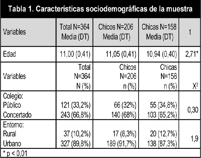 En lo que se refiere a las características sociodemográficas de la muestra (tabla 1), la edad media de los sujetos era de 11 años (rango = 1013). El 56,6% de la muestra eran chicos (N=206) y el 43,4% eran chicas (N=158).
