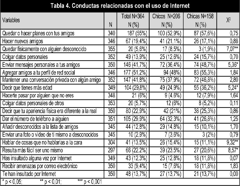 Un dato importante a destacar es el uso diario de Internet. La mayor parte de los estudiantes se conecta todos los días, y son muy pocos los que dejan de hacerlo los fines de semana, momento de uso masivo de la Red. En este sentido, destaca el uso mayoritario de las redes sociales (Messenger, Facebook, Tuenti...), a pesar de encontrarse en una edad inferior a la legalmente permitida para hacerlo. Cuando se analiza el tipo de personas con las que se comunican por dichas redes sociales, hay diferencias significativas entre chicos y chicas. Ellas utilizan más Internet para la comunicación con otras personas, principalmente amigos y familiares. Ellos, aunque lo utilizan significativamente menos que las chicas para comunicarse con otras personas, se comunican más que ellas con amigos virtuales que no conocen cara a cara.