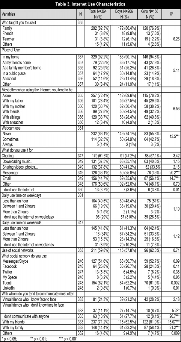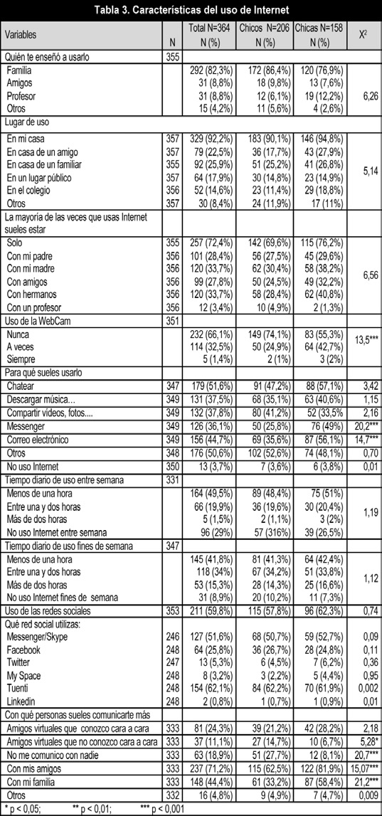En lo que se refiere a las características del uso de Internet, la mayor parte de los adolescentes de la muestra utilizan Internet cuando están en casa y la mayor parte de las veces en solitario, sin ningún control por parte de los padres (tabla 3 en la página 117). El uso de la webcam se observa en uno de cada tres casos, con diferencias significativas en función de sexo. Las chicas utilizan la webcam de forma significativamente más frecuente que los chicos.