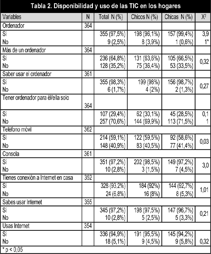 En la tabla 2 se presentan los resultados obtenidos en cuanto a la disponibilidad de TIC en el hogar, así como la comparación de los datos en función del sexo. La práctica totalidad de la muestra cuenta con un ordenador en casa y afirma saber usarlo. La mayoría posee también una videoconsola y más de la mitad cuenta con teléfono móvil. Además, la existencia de conexión a Internet, así como el uso de la Red, es mayoritaria en los adolescentes estudiados.