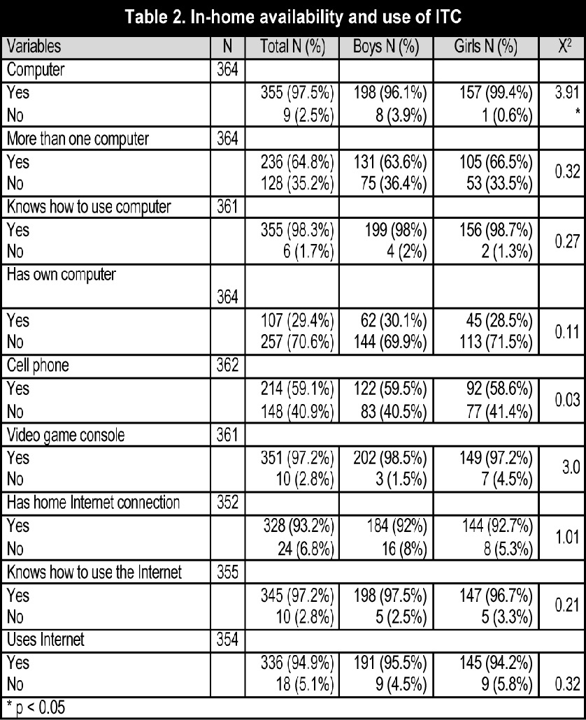 Almost the entire sample has a home computer and knows how to use it. The majority also has a video game console and more than half have a mobile phone. Moreover, an Internet connection and Internet use is present for the majority of the adolescents studied.