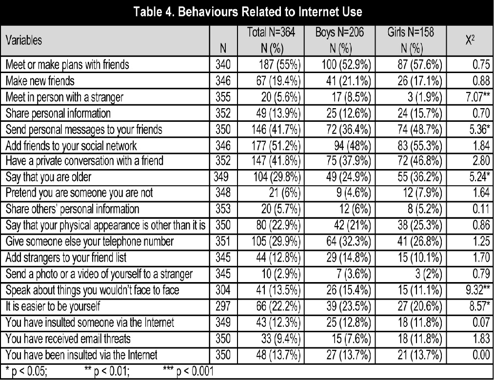 Noticeably risky behaviours are also observed in the results, when taking into account the age of the sample: sending photographs or videos to strangers, adding strangers to friend lists, giving out telephone numbers or other types of personal information, sending photos or videos through the network, or the most dangerous behaviour of all: meeting up directly with strangers. The comparison based on gender reflects significant differences in three of the variables studied. Boys are more likely to meet with strangers, whereas girls use the Internet more to send personal messages to friends and to lie about their age.