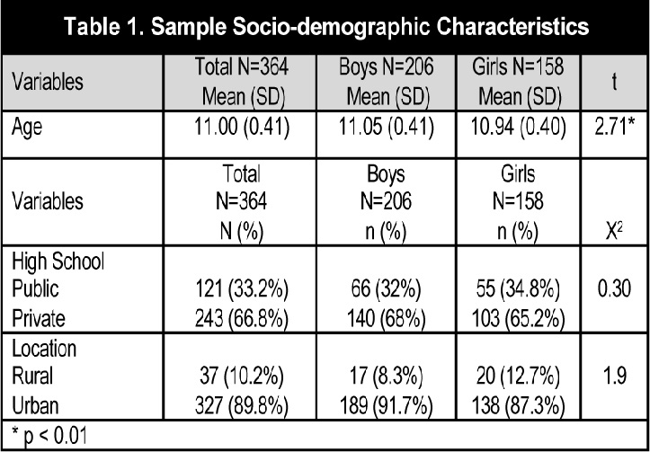 With respect to the sample’s socio-demographic characteristics (table 1), the median age of the subjects was 11 (range=10-13). 56.6% of the sample was boys (N=206) and 43.4% were girls (N=158).