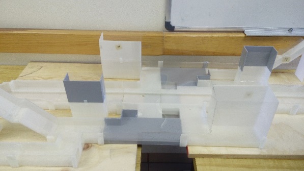 In this case, this model allow us to validate the assembling process between all the sections and make corrections if needed. For convenience of this picture, the bottom stairs were located on top of the model upside down (number 11 in the picture). Once the entire model was validated, a 1:100 scaled model was finally printed. It is recommended to create a numbered map and list of all the pieces to avoid confusion during the assembling. In this form, the model can be easily transported to a preferred location for the experiments. Figure 16 shows the resulting assembled model, now the bottom stairs are properly located at the bottom face of the model.