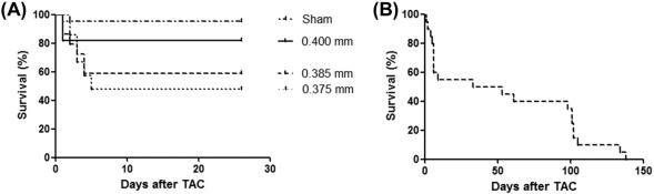 Fig. 2. Survival curves in TAC operation. (A) Mice were subjected to TAC operation with three kinds of gauges and followed for 4 weeks. Sham, n = 21; 0.400 mm, n = 11; 0.385 mm, n = 29; 0.375 mm, n = 22. (B) Mice were subjected to TAC operation with the 0.385 mm pin gauge and followed for 5 months. n = 20. |