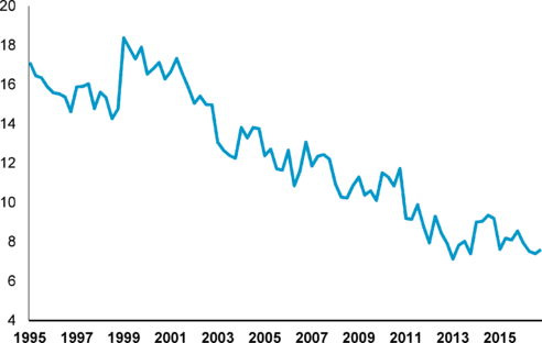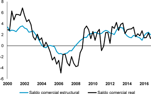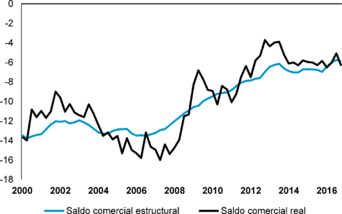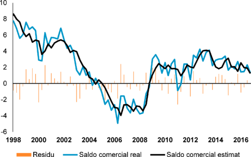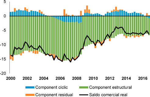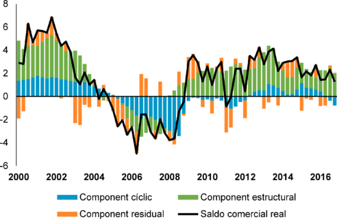 Tal com es pot apreciar al gràfic 5, el saldo comercial real experimenta una forta correcció entre 2007 i 2016, d’uns 9 punts percentuals del PIB. Això coincideix amb la continuïtat en la reducció del component estructural, però també amb un canvi de signe del component cíclic, que abandona les posicions deficitàries màximes que havia assolit el 2008 i se situa en terreny positiu fins a mitjans de 2016. Resulta significatiu l’entrad en negatiu de la component cíclica estimada del saldo comercial en els dos darrers trimestres de 2016 en un context de major puixança econòmica.