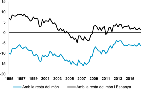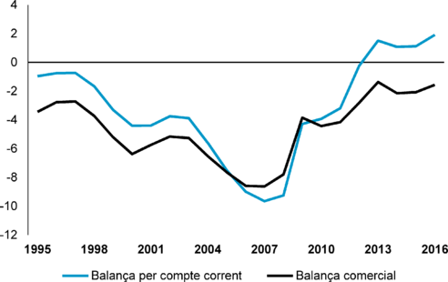 L’etapa expansiva que van viure les economies catalana i espanyola entre l’any 2000 i el 2007 va provocar l’acumulació d’importants desequilibris macroeconòmics que s’han anat corregint progressivament durant els anys de crisi posteriors. Un dels desequilibris més representatius ha estat el saldo per compte corrent espanyol, que des d’un dèficit de pràcticament el 10% del PIB el 2007, va registrar un superàvit proper al 2% al 2017. Aquesta correcció, de 12 punts percentuals, és molt notable, de fet sense precedents en la història del país o en altres països de característiques similars. En aquest context, també Catalunya ha experimentat un comportament similar en la seva balança comercial.