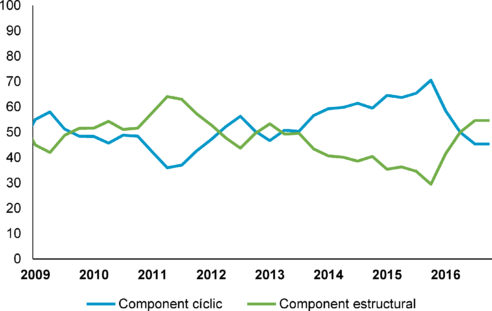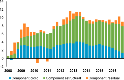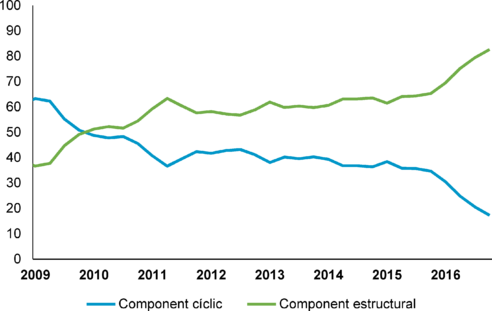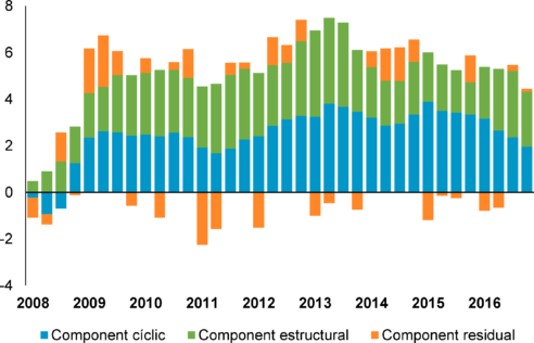 Tal com mostra el gràfic 6, aquesta correcció de 9 p.p. s’ha produït gràcies a la contribució d’ambdós factors, tot i que la del component estructural, del voltant del 70%, és notablement superior a l’ajust impulsat pel deteriorament del cicle (c. 15%), tant domèstic com internacional. La resta de l’ajust, al voltant d’un 15% correspon al residu del model.