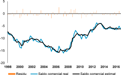 La regressió té una bondat d’ajust elevada (R2 ajustada del 92%) i és robusta a tests d’autocorrelació en els residus i d’heteroscedasticitat, així com de multicol·linealitat de les variables explicatives. El següent gràfic mostra el bon ajust de l’estimació del model amb la sèrie de saldo comercial.