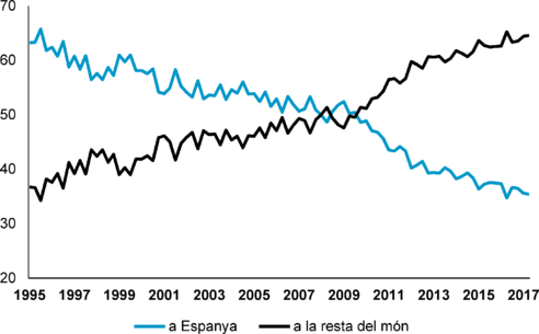 On representa el saldo comercial de Catalunya en proporció del PIB que es pot definir en relació amb la resta del món (veure secció 4) o, en sentit més ampli, incloent també els fluxos interregionals amb la restat d’Espanya (veure secció 5). La distinció entre ambdós saldos pot ser útil, ja que com es mostra en el següent gràfic, el destí de les exportacions de Catalunya ha anat canviant de forma constant en els últims anys. Així, les exportacions a la resta d’Espanya han perdut pes a favor de les exportacions a la resta del món.